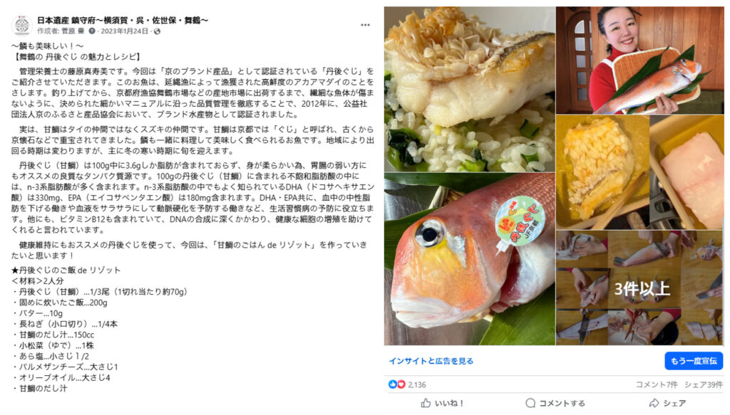 また、舞鶴市の丹後ぐじ(甘鯛)は、京都・丹後地方で古くから珍重されてきた高級魚で、淡泊で繊細な旨味が特長です。身質は柔らかく、脂肪分が少ないものの不飽和脂肪酸(DHA・EPA)やビタミンB12といった栄養素を含んでおり、生活習慣病予防にも寄与することが知られています。こうした背景を丁寧に解説しながら、地域の季節食材として「ご飯 de リゾット」といったアプローチで紹介することで、単なるメニュー紹介を超えて、地域の食文化への理解を促すコンテンツになっています。