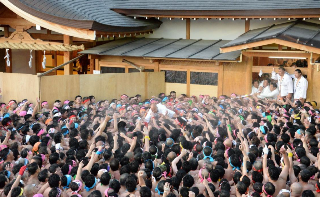 神男に触れることで厄が落ちるとされ、裸男たちが押し寄せる激しいもみ合いが繰り広げられる。この一連の約60分間が神事の最大の見どころとなる。神事は午後3時ごろ始まる。