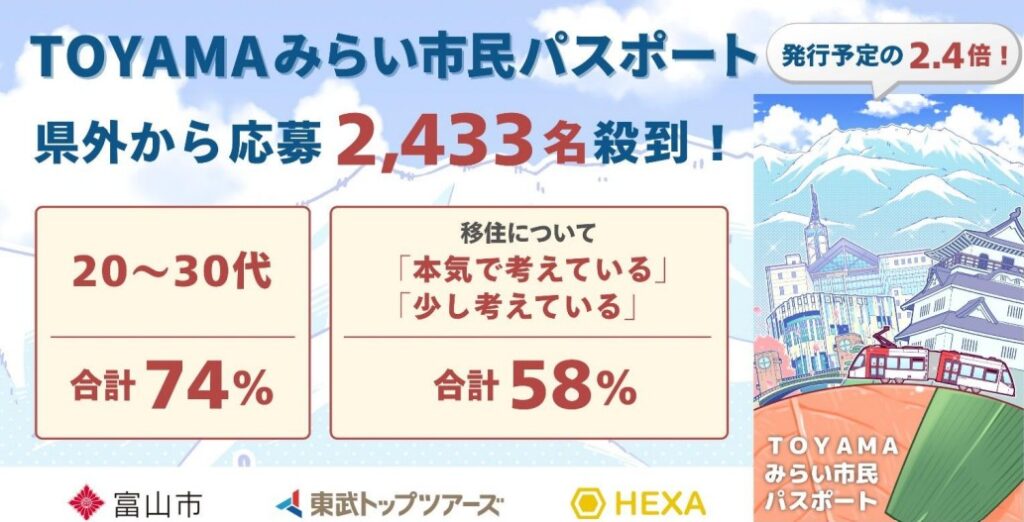 東武トップツアーズは2月15日、富山市およびNFTマーケットプレイス「HEXA」を運営するメディアエクイティと連携して実施した関係人口創出施策「TOYAMAみらい市民パスポート」の募集を終了したことを発表した。発行予定数1,000枚に対し、約2.4倍となる応募が集まり、県外在住者を対象とした取り組みを今後も展開していく。