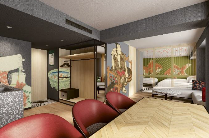 オリックス・ホテルマネジメントは7月3日、東京都台東区浅草にライフスタイル・アパートメントホテル「クロススイーツ東京浅草」を開業する。(写真は金魚スイートルーム)