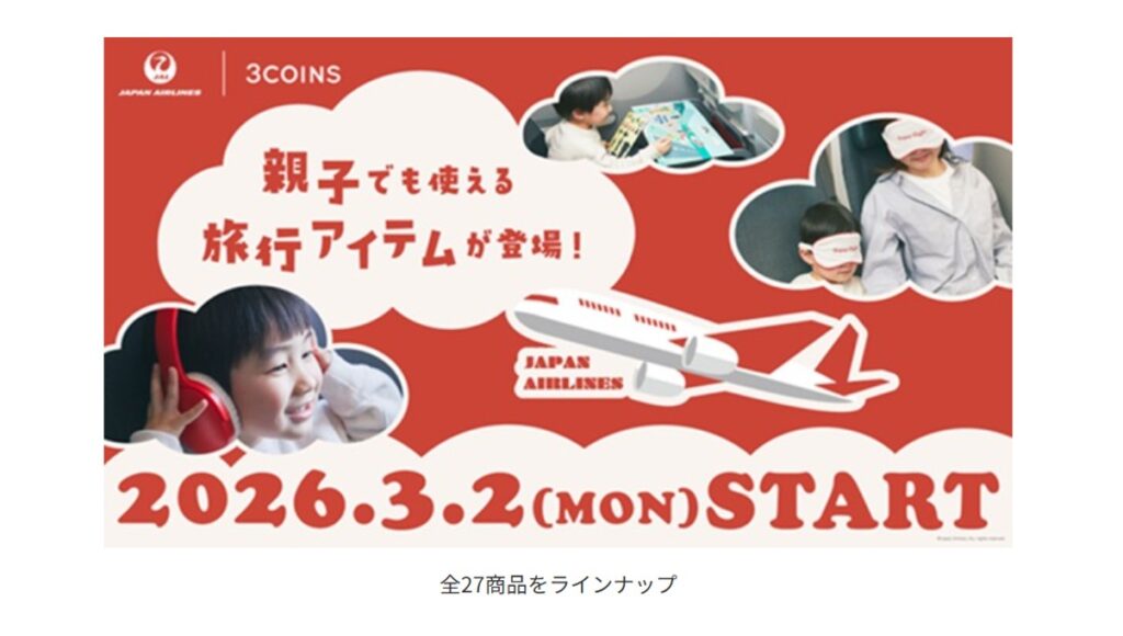 また、商品販売を記念して、JALの国内線航空券や3COINSオンラインストアで使えるクーポン券が当たる搭乗キャンペーンを実施する。3月1日~5月31日(5月1~6日除く)までの期間にJAL国内線を搭乗し、キャンペーンに参加した人のなかから抽選で、2人に国内線航空券、30人にクーポン券が当たる。