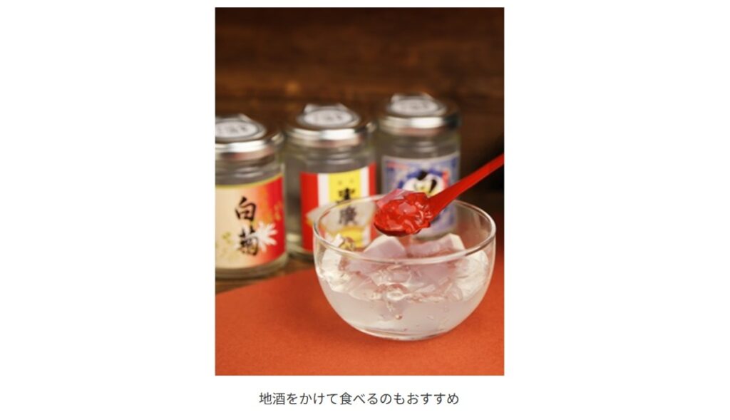 同商品は、輪島の地酒と能登の塩を使った和風ゼリーで、優しい甘さとほどよい塩味が調和した一品。そこに地酒を加える斬新な食べ方も提案する。使用する地酒は3蔵の「奥能登の白菊」「金瓢白駒」「能登末廣」。