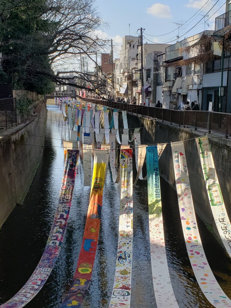 会場では幅8メートルほどの妙正寺川に、反物を渡す「川のギャラリー」が来場者を迎えていた。かつて職人が川で反物を洗っていた風景を現代に重ねる演出で、色とりどりの染色作品が水辺の景観を彩っていた。