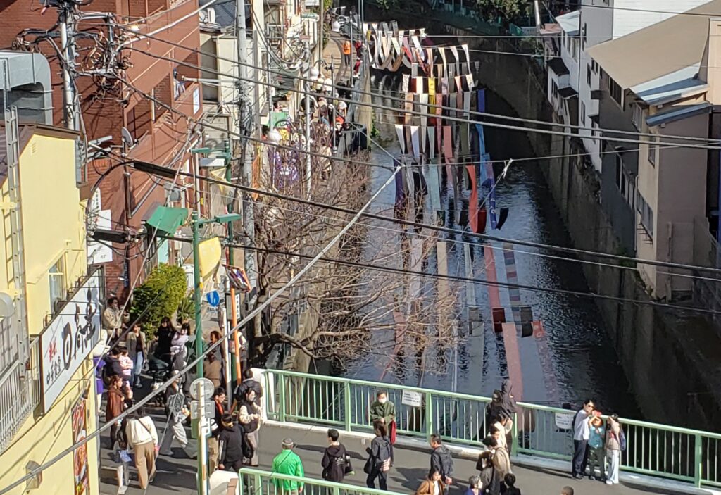 会場では幅8メートルほどの妙正寺川に、反物を渡す「川のギャラリー」が来場者を迎えていた。かつて職人が川で反物を洗っていた風景を現代に重ねる演出で、色とりどりの染色作品が水辺の景観を彩っていた。