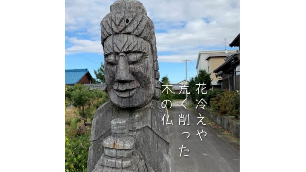 早春の底冷えが残る二月。今回の一句は、岐阜羽島駅の近くで出会った「円空仏」を詠んだものです。江戸時代の僧・円空は生涯で十二万体もの仏を彫ったと伝えられています。愛知県や岐阜県に多く、生誕の地・羽島市の資料館を訪ねたこともありますが、円空仏の多くはこの写真のように野に置かれています。「庶民の暮らしに寄り添いたい」という円空自身の願いだったといいます。ゴツゴツとした荒削りの野生味の中に、どこか慈愛に満ちた不思議な微笑みをたたえている。そんな姿に私は惹かれます。花冷えの空気の中で静かに佇む仏の姿は、凍える指先に春の柔らかな日差しを運んでくれるようでした。