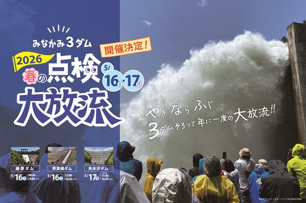 群馬県・みなかみ町観光協会はこのほど、5月16日(土)と17日(日)に実施する「みなかみ3ダム 春の点検大放流2026(やぎならふじ)」のチケットを売り出した。利根川最上流域に位置する矢木沢ダム、奈良俣ダム、藤原ダムの3ダムが洪水期に実施する「点検放流」を一般公開する特別イベント。