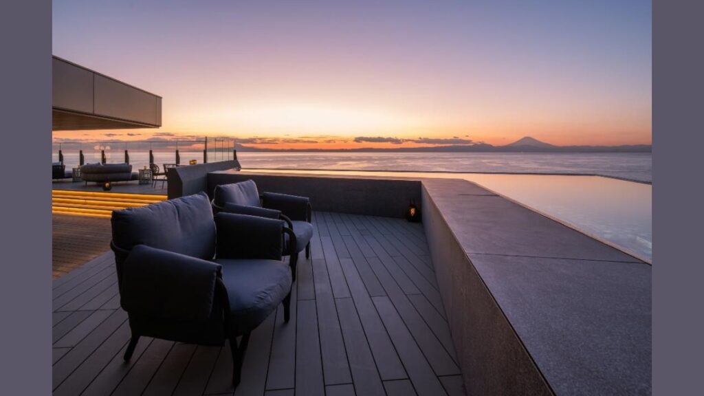 客室は全34室で、すべての客室から海を望む設計。客室温泉から潮風を感じながら入浴できるほか、海の向こうに浮かぶ富士山や夕日の景観が楽しめる。食事は三浦半島の海の幸を中心とした料理を提供する。