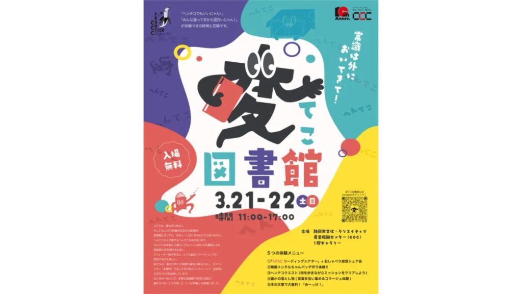 CCC楽校5期生は3月21日から22日、静岡市文化・クリエイティブ産業振興センター(CCC)にて、体験型文化企画「変てこ図書館 ~常識は外においてきて~」を開催する。SPAC(静岡県舞台芸術センター)出演の朗読劇をはじめ、本・アート・ゲームなど5つの体験プログラムを通じて、人それぞれの価値観や感情のちがいに出会える場を提供する。参加費は無料で、年齢や背景を問わず誰でも参加できる。
