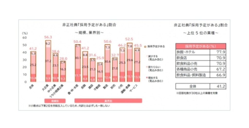 業界別では運輸・倉庫や製造に加え、医療・福祉などで採用意欲が高水準となった。観光関連では、インバウンド需要の回復を背景に旅館・ホテル分野で非正社員の採用意向が約8割に達し、宿泊業の人材需要の強さが際立っている。飲食や小売も含め、観光消費に関連する業種では人手確保が引き続き重要課題となっている。