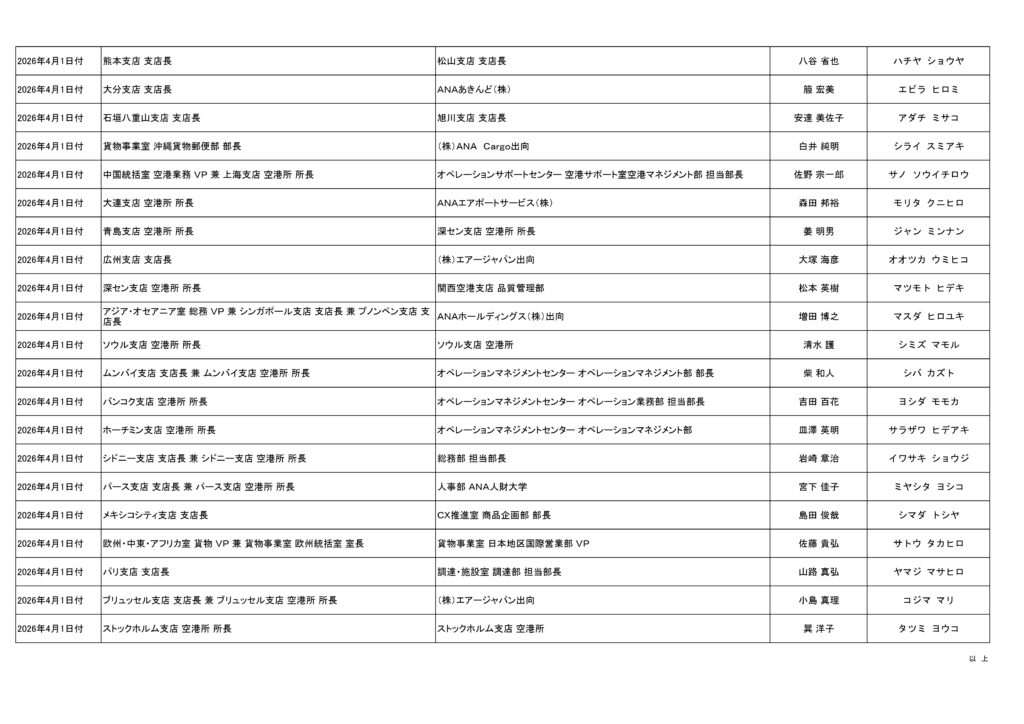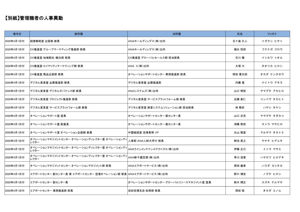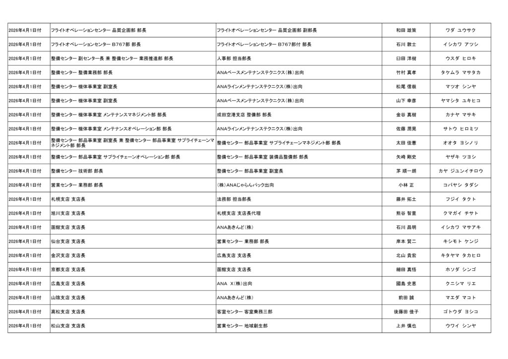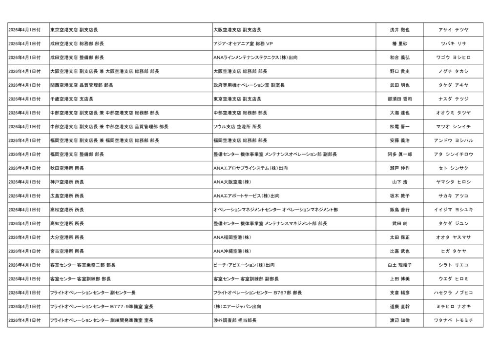全日本空輸(ANA)は3月24日、2026年4月1日付での管理職人事を発表した。