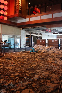 吹き抜け部分に散乱したガラスや大理石の破片が