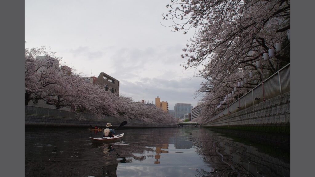 ほぼ満開の4月4日早朝、まだ和船も観光船いない大横川でカヤックを漕いできた。