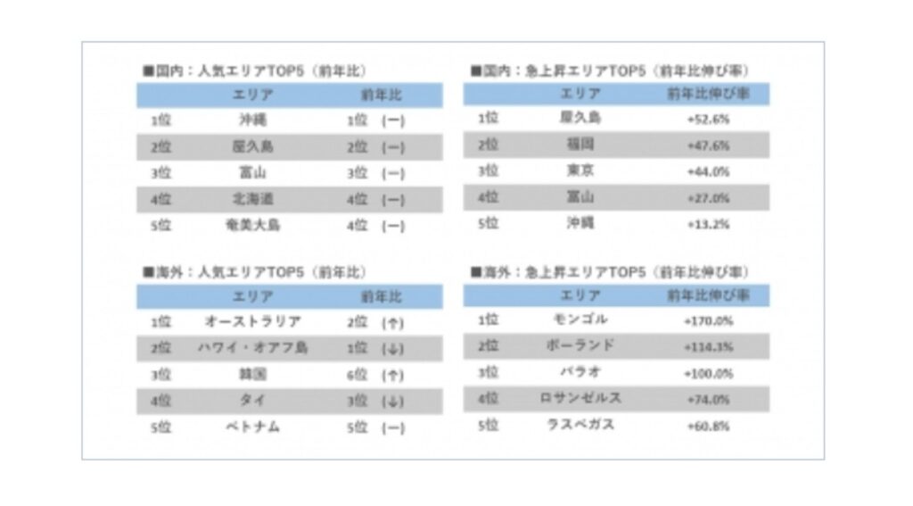 国内では沖縄と北海道が引き続き人気を維持する中、屋久島が前年比52.6%増で急上昇トップとなった。海外渡航を控えた層が、国内でも非日常性の高い離島へ予算を振り向けている。また富山もSNSで話題となった「雪の大谷」により同27.0%増と伸長し、期間限定の絶景を求める動きが見られる。