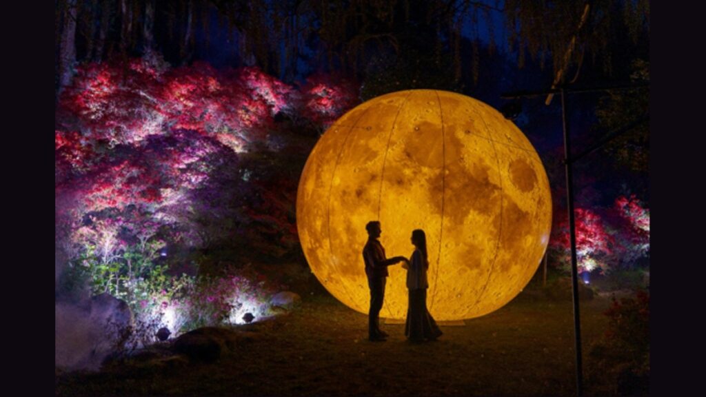 演出は福岡市を拠点とするデジタルアート企業ランハンシャが担当。会場には月をモチーフとした光の演出を取り入れ、つつじの色彩と照明を組み合わせた空間を作った。来場者は園内を巡りながら楽しめる。