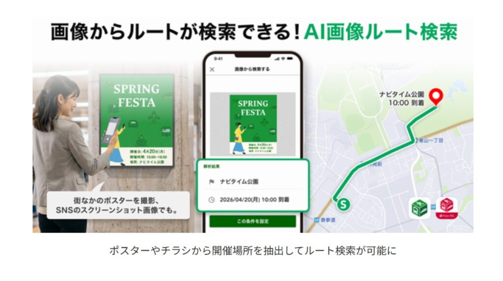 新機能では、イベント情報が記載されたポスターやチラシ、SNSの写真やスクリーンショットなどに対応。画像をアプリに読み込ませると、イベントの開催場所や日時などの情報を生成AIが自動で抽出し、そのままルート検索画面に反映される。新幹線の紙チケットも読み取りできる。