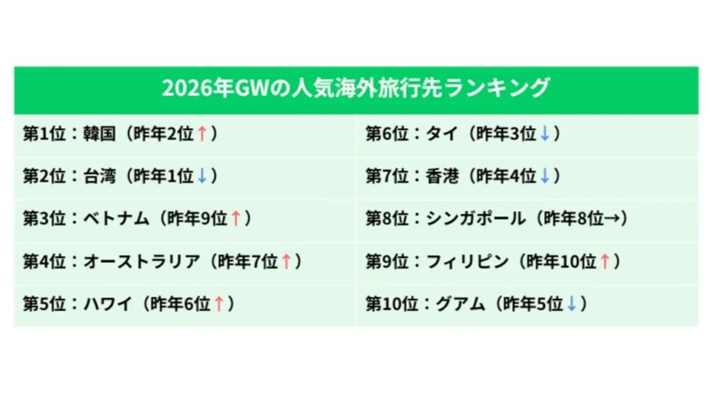 渡航先別では韓国が45.9%と約半数を占め、突出した人気を維持した。フライト時間の短さに加え、LCCの充実による価格優位性が大きく影響している。さらに、美容施術やグルメ、エンターテインメントなど目的特化型の消費が成立しやすく、短期間でも高い満足度が得られる点が評価された。GWの限られた日程の中で、「時間効率」と「体験価値」を両立できる渡航先として選好が集中した格好だ。